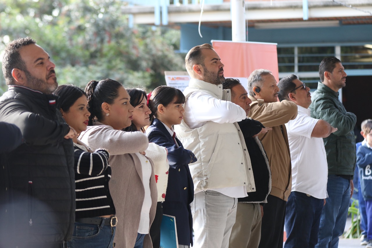 En compañía de estudiantes, docentes y padres de familia, el alcalde encabezó los honores a la bandera y posteriormente anunció la conclusión de la obra de rehabilitación de las instalaciones del plantel educativo. En total, se destinaron 2.2 millones de pesos para la construcción de 170 metros de muro perimetral, mejorando así la seguridad y el entorno escolar.
