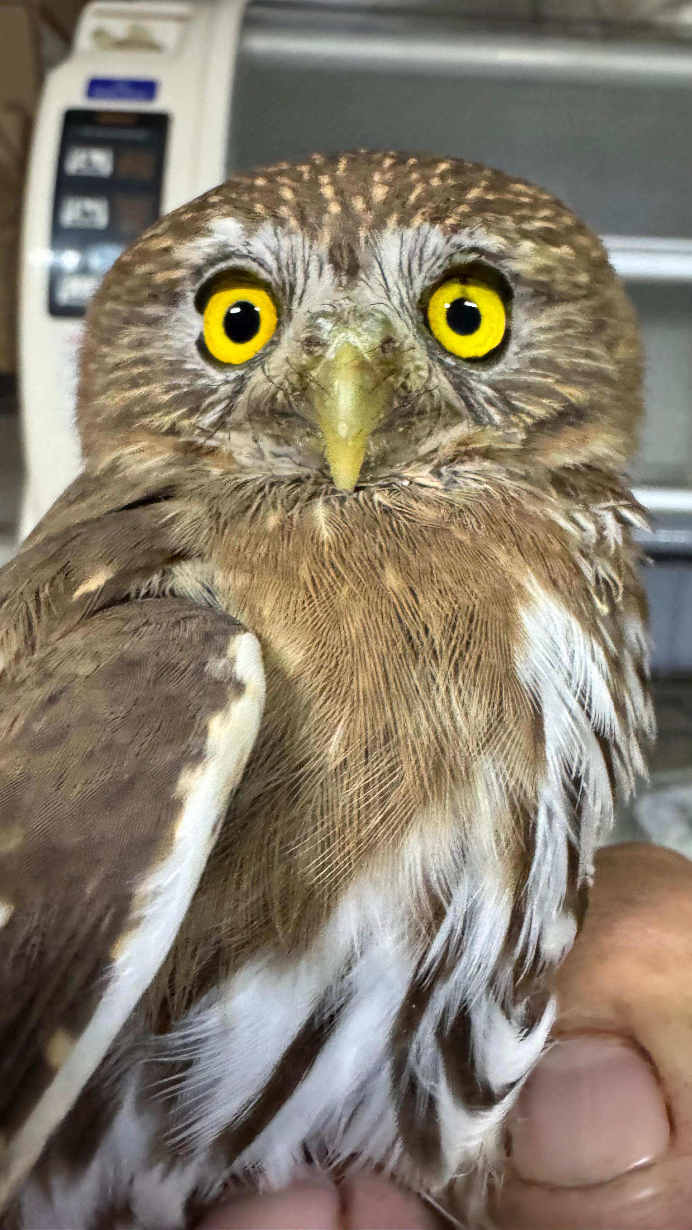 Especialistas de la Unidad de Rescate de Fauna Silvestre de Tlajomulco resguardan a un búho bajeño o búho pigmeo que fue rescatado por oficiales de Protección Civil y Bomberos de aquel municipio, luego de que fuera localizado sin poder emprender el vuelo por alguna lesión, en inmediaciones de esa cabecera municipal.
