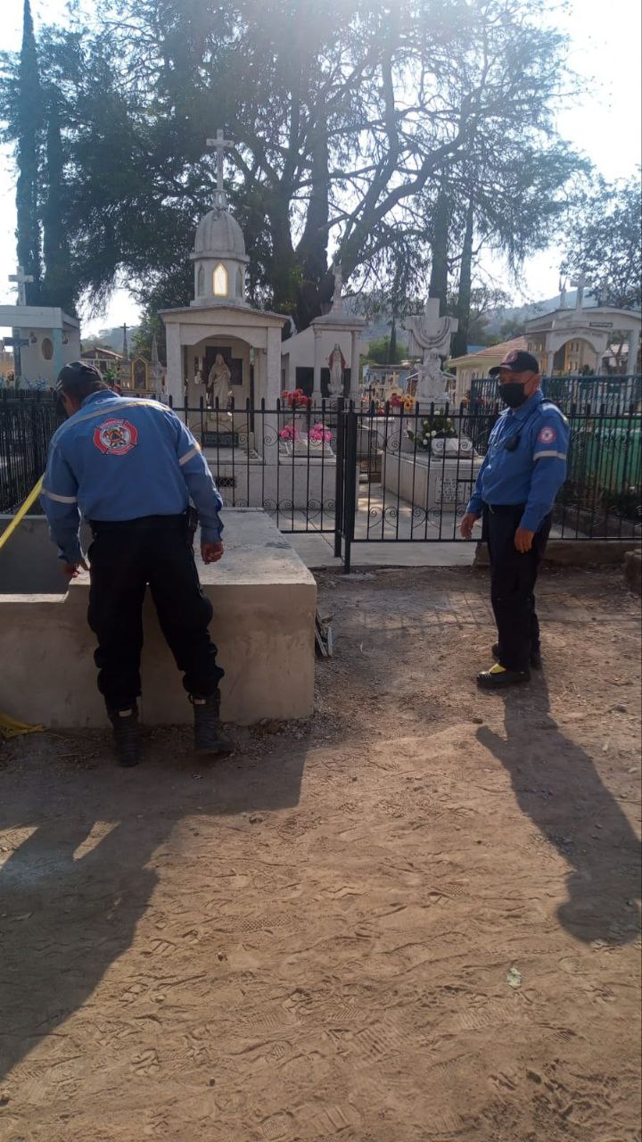 Oficiales de Protección Civil y Bomberos realizaron la revisión de las condiciones de seguridad que guardan los cementerios. Realizaron el acordonamiento de 194 criptas que representaban algún riesgo, además realizaron el retiro de un enjambre de abejas.