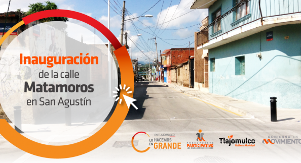 Este miércoles se inauguró la rehabilitación de la calle Matamoros en la delegación de San Agustín, otro de los compromisos del Gobierno de Tlajomulco que figuró en la obras elegidas del Presupuesto Participativo, programa que ha sido un éxito en esta y la administración pasada, según comentó el Presidente Municipal, Ismael Del Toro: