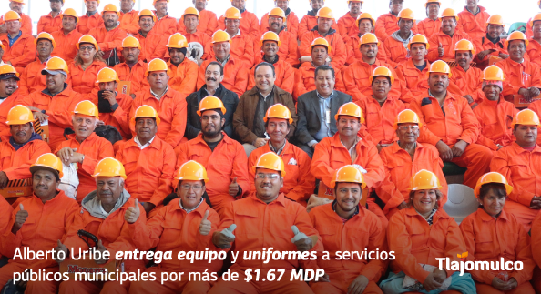 Esta mañana, Alberto Uribe Camacho, Presidente Municipal de Tlajomulco de Zúñiga, realizó la entrega de equipamiento y uniformes a la Coordinación General de Servicios Públicos Municipales y anunció incrementos salariales para los trabajadores de la Dirección de Servicios Públicos Municipales.