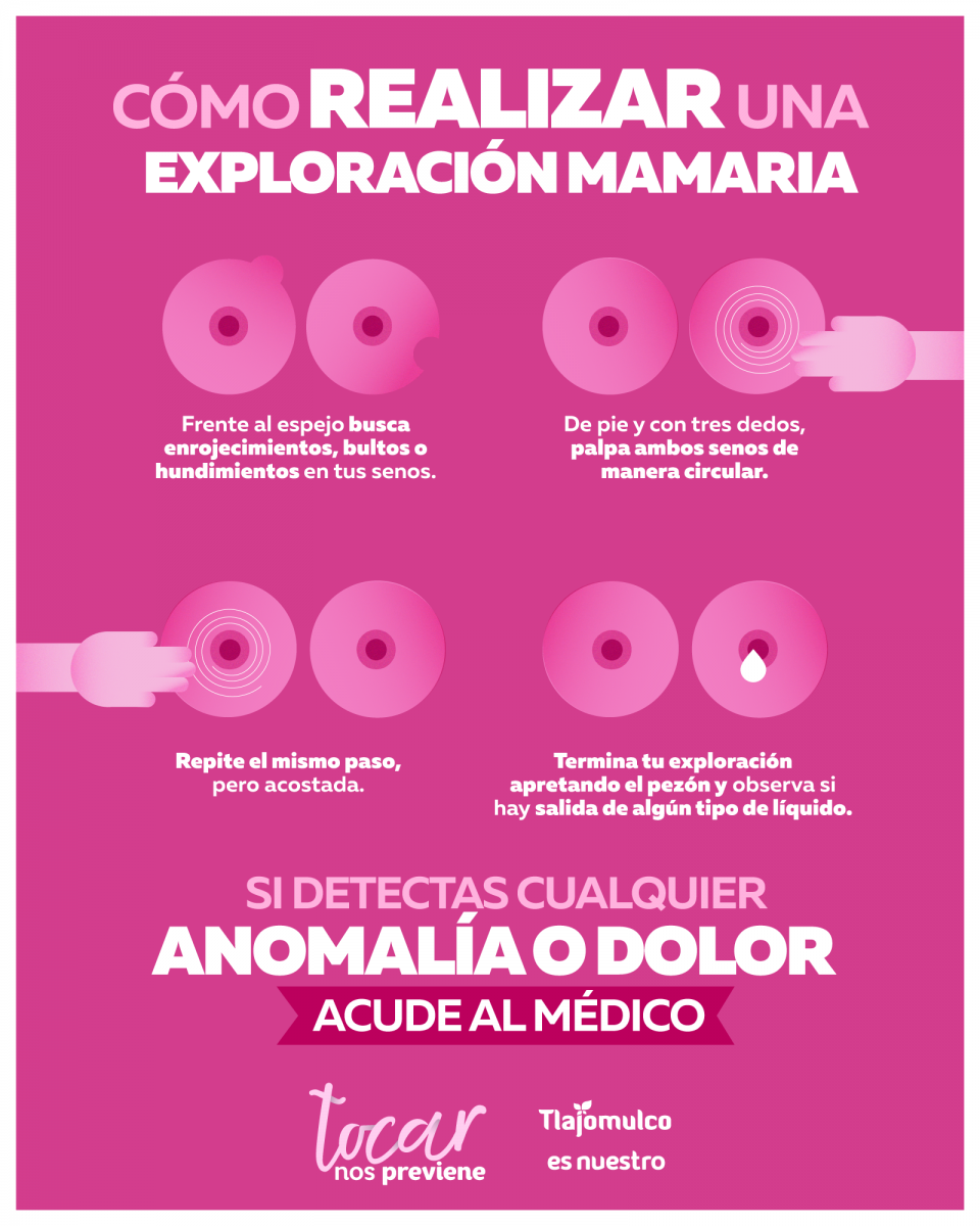 Recuerda que una de las formas de prevenir esta enfermedad es autoexplorándote al menos una vez al mes, a partir de que cumplas 20 años. En la imagen te compartimos cómo hacerlo.
